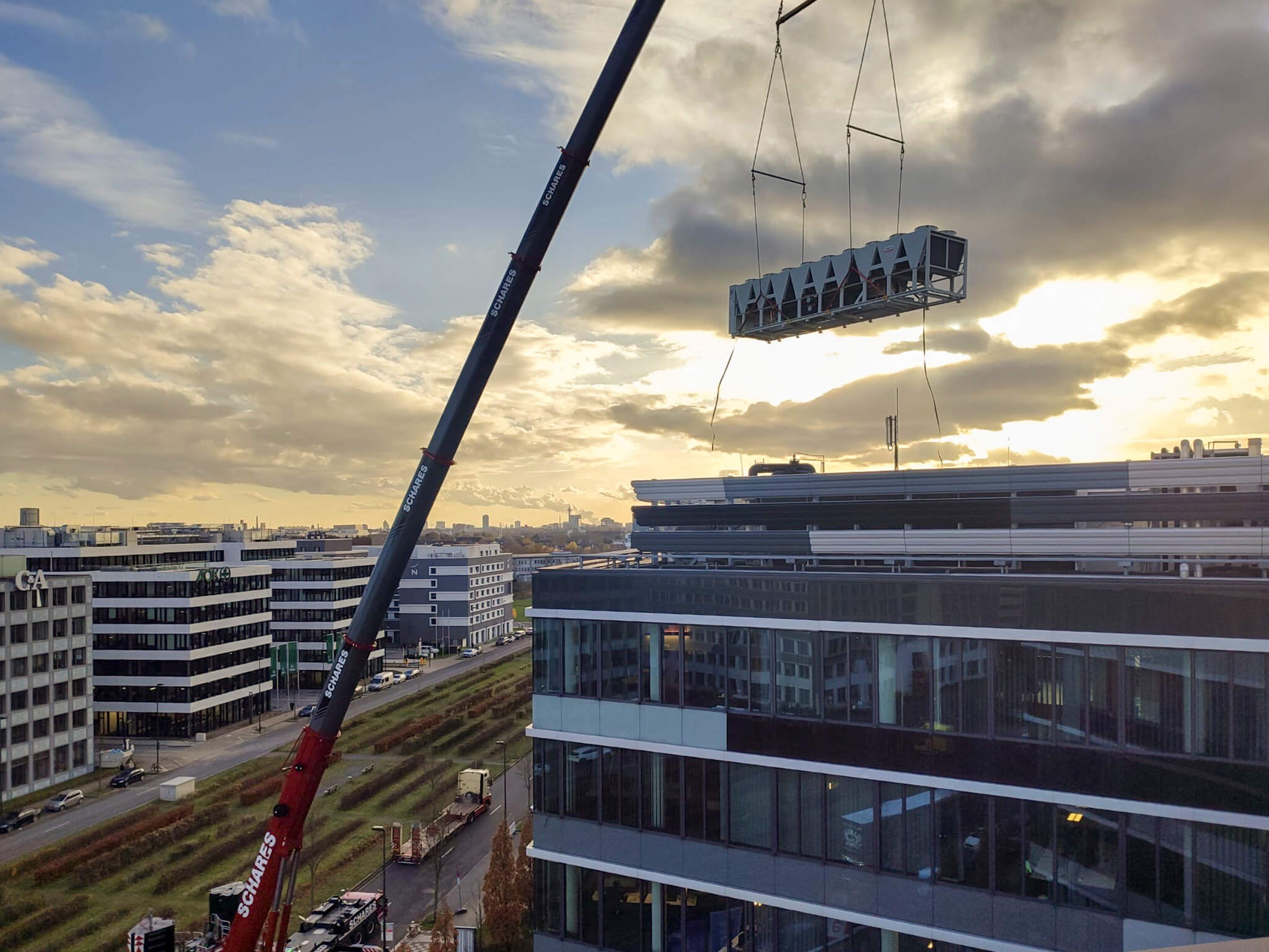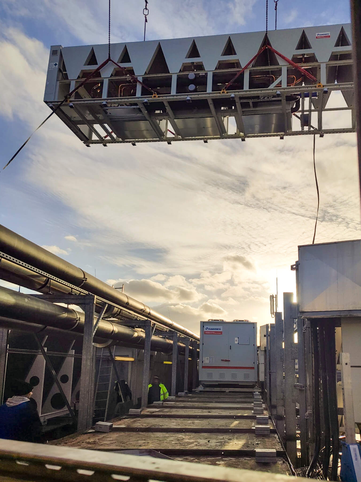 In einem Rechenzentrum Düsseldorf wurden die alten Kältemaschinen durch zwei moderne und energieeffiziente Kältemaschinen von Mitsubishi Electric/Climaveneta mit jeweils 1,2 MW Kälteleistung ersetzt.